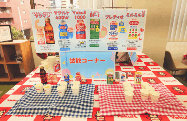 試飲会では、6種類の乳製品とスペシャルドリンク「ヤクマン(ヤクルト+タフマン)」をお試しいただきました😊